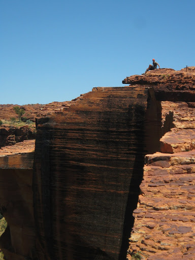 El dia següent ens dirigim cap al Kings Canyon, a uns 500 km. Són unes formacions rocoses de milions d’anys d’antiguitat, ofereixen un espectacular canyó o gorja amb unes parets rectes i immenses. Hi fem un trekking d’uns 6 km, el Kings Canyon Rims Walk on dones la volta a tota la gorja per la part superior, s’ha d’anar amb força compte als penya segats. Fem uns quants quilòmetres més per carretera fins que es fa fosc per fer nit i el dia següent arribar altre cop a Alice Springs per agafar el vol cap a Cairns. Una sorpresa d’última hora ens espera al motel de carretera; heu vist mai algun gos que canta i toca el piano per la televisió? Doncs si, és ell, el Dingui li deien, i realment és de la raça Dingo, com un llop però originari d’Àsia. Ens va fer una demostració força sorollosa.